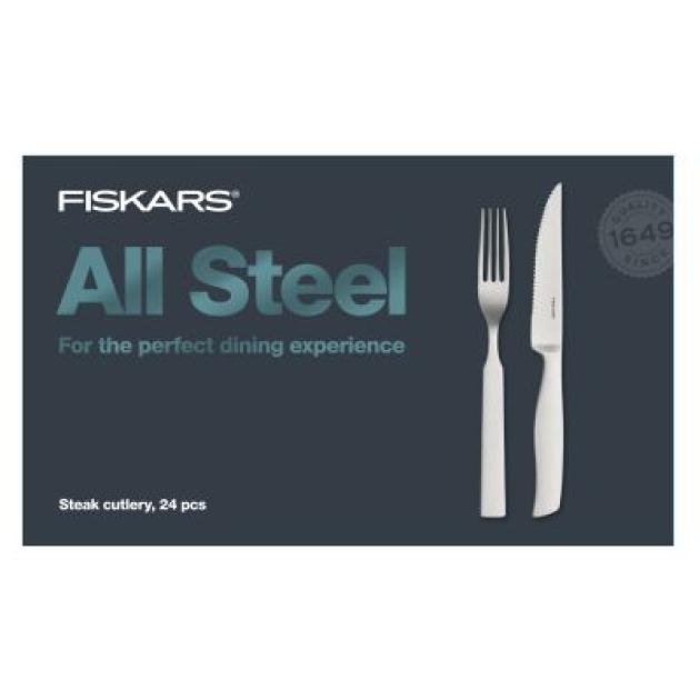 Fiskars All Steel steikeriistad on valmistatud kvaliteetsest roostevabast terasest Soomes Sorsakoski tehases. 24-osaline kaasaegse disainiga kahvlite ja nugade komplekt on mõeldud 12-le inimesele.