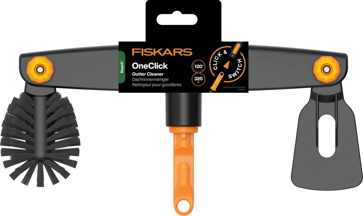 Fiskars OneClick vihmaveerennide puhasti on mõeldud vihmaveerennide tõhusaks hooldamiseks otse maapinnalt. See ühendab endas kraapija jämedate ja kinnitunud mustuse eemaldamiseks ning ümarharja lõplikuks puhastamiseks. Tänu reguleeritavale tööpea nurgale ja teleskoopvarrele puhastate OneClickiga vihmaveerennid kiiresti ja ilma redelil töötamisega seotud riskideta.